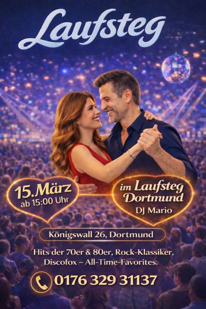 Am Sonntag den 15. März ab 15:00 Uhr lädt der Laufsteg Dortmund zu einem stilvollen Tanznachmittag im Herzen der Stadt ein. Freut euch auf eine besondere Atmosphäre, gute Musik und eine Tanzfläche voller Energie.