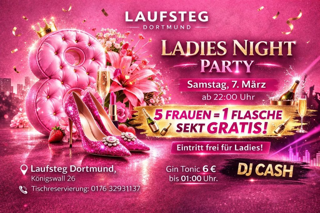 Anlässlich des Internationalen Frauentags am 8. März veranstaltet das Laufsteg Dortmund eine exklusive Ladies Night als stilvolle Vorfeier. Am Samstag, den 7. März, ab 22:00 Uhr erwartet Sie ein Abend in anspruchsvollem Ambiente mit besonderen Highlights.